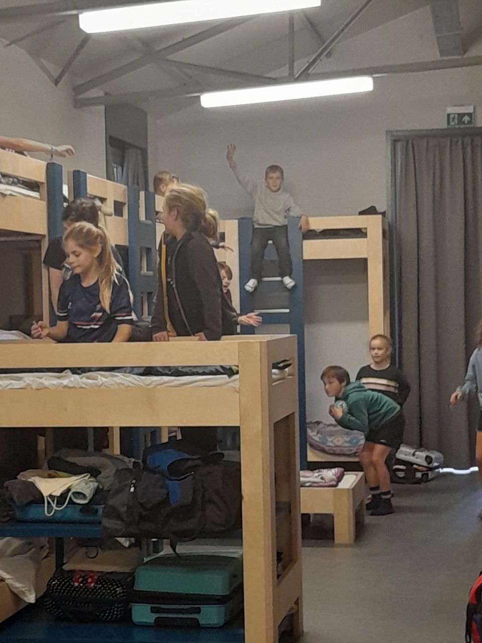 Om 11 uur was de begleiding aangekomen bij gebouw 14 op de Hoge Rielen. Terwijl we alles klaarzetten en een eerste verkenning deden van de locatie, arriveerden de kinderen om 12 uur samen met hun ouders. Voor velen van de U9 was het een van de eerste meerdaagse stages, hoewel sommige, zoals Otto wel gepakt leken voor een meerweekse stage. In no-time hielpen de ouders hun kinderen met het installeren in de grote slaapzalen. De U9 kreeg de slaapzolder, waar al snel matrassen in het rond vlogen voor het zogenaamde "matrassurfen." Ondertussen installeerden de U11 en U13 zich in de grote slaapzaal beneden, die volstond met stapelbedden en al snel omgedoopt werd tot “stapelbeddenkasteel.” De U17, die de dag nog in Bobbejaanland doorbrachten, sloten pas later op de avond aan en kregen een slaapbox buiten.