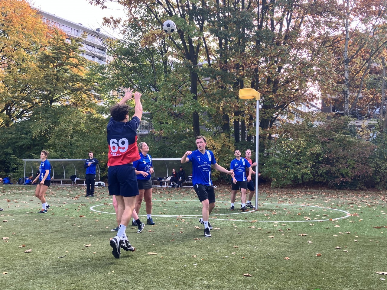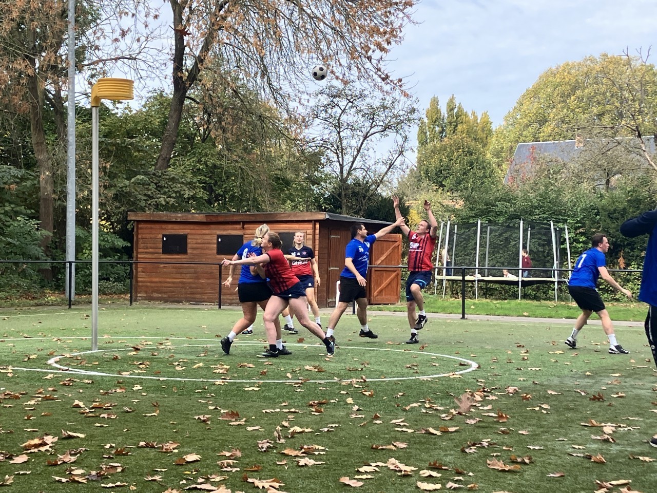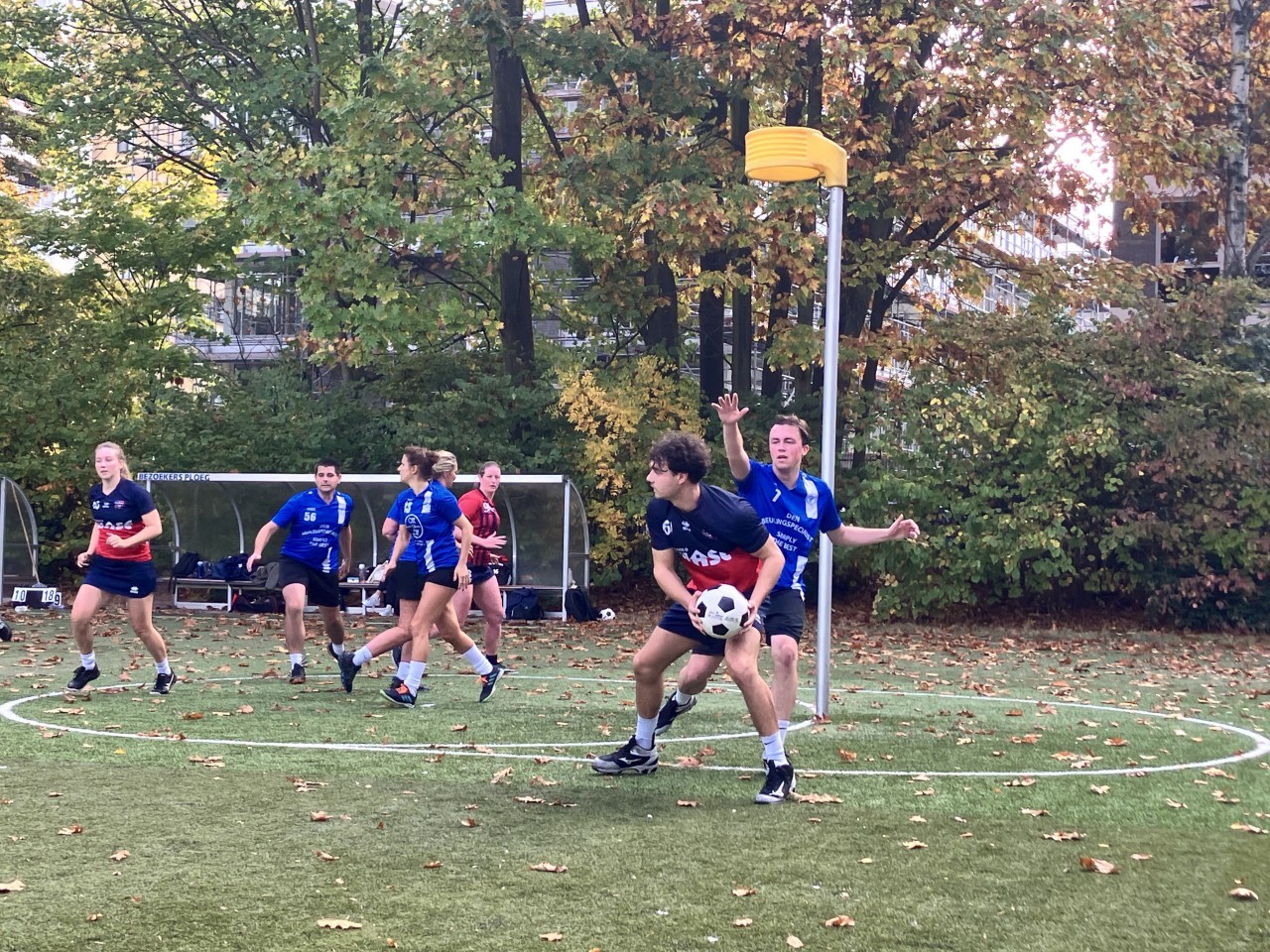 Zondagmiddag. Grijze lucht, bladertapijtje op het veld, warme koffie — de ideale omstandigheden voor een pot korfbal op de velden van Minerva.