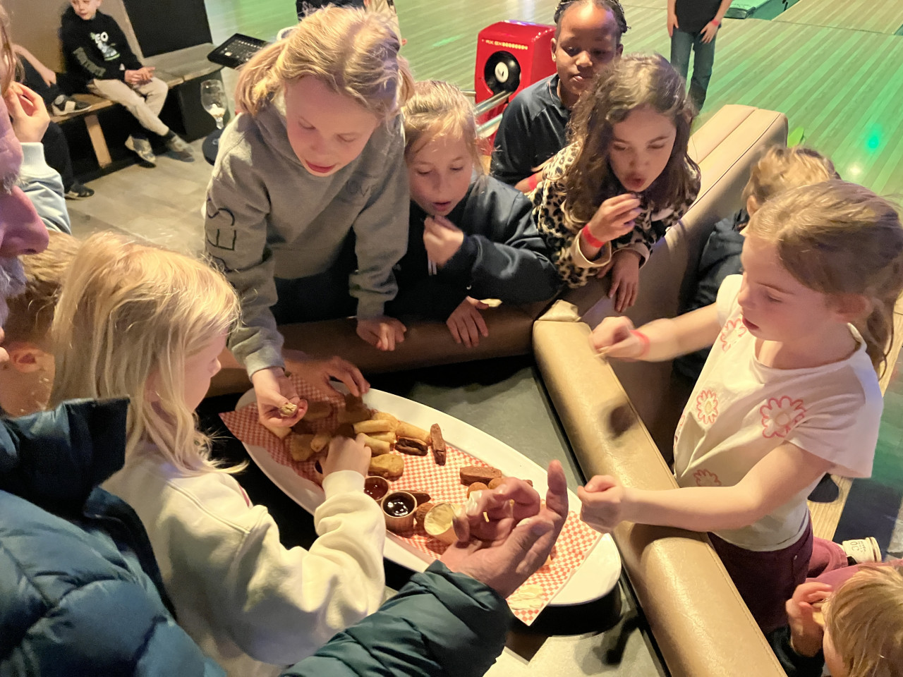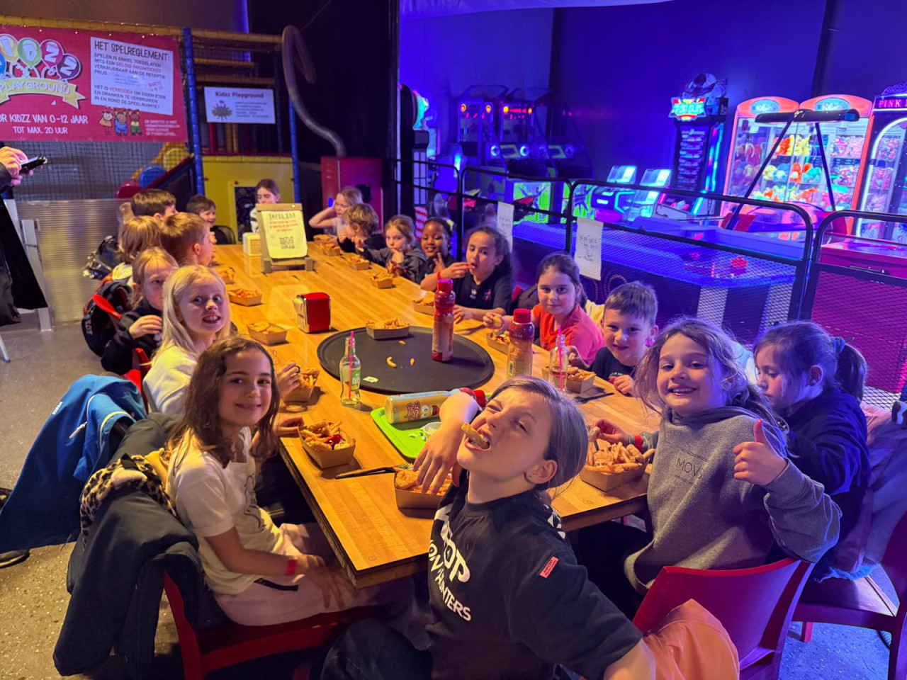 Na het bowlen was de energie nog lang niet op. Terwijl er nog even flink werd geravot in de speeltuin, bereidde de keuken de ultieme sportmaaltijd voor: frietjes met kippennuggets.